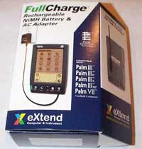 You may notice that the unit I have installed the FullCharge into is a TRGpro. With continued Compact Flash access one can burn through batteries rather quickly. I chose this unit as my testing platform to see just how well the FullCharge survives. Much to my surprise the FullCharge seemed to perform equally as well as alkalines. I did not notice any appreciable decrease in battery life vs. standard alkaline batteries; even under this kind of drain (constant CF read/writes). Notice that I mention perceived power. I found that the battery "fuel" meter in my PalmOS 3.3 device did seem to "drain" quickly. Then I remembered something about a dot shortcut. I remembered that by stroking the shortcut command followed by ".7" (dot seven) the battery type can be toggled. On my Palm device running PalmOS 3.3, toggling this to "NiMH" showed accurate battery consumption. eXtend does mention the battery gauge issue in the directions (very thorough), and points out that "shareware/freeware is available", but they do not explain the simple "fix" above. They do indicate that they will have a software patch available on their web site; I don't believe it is available yet. The unit is built VERY nicely. The directions are very simple to follow and do a LOT of explaining about charging cycles, operating times, and comparisons to other rechargeable technology such as NiCad. Even better, the unit is designed to be almost fool proof. The battery can really only be installed in one manner thanks to it's clever design. And, although the charger can be connected improperly, it will NOT damage the unit thanks to the smart electronics in the adapter. The other real nice thing about this unit is the charging LED indicator. This indicator flashes steady RED while charging and once fully charged flickers periodically to maintain charge. In fact, the LED will only glow RED if the charger is plugged in correctly. And, the charger pin end has a small tab to help easily pull the 2-pin plug off the back of your Palm, all nice touches. The packing is great, and the best feature of that is the NiMH cell comes partially charged. This seems like a small thing, but the cells CANNOT be charged outside the Palm device. This means if they were shipped dead, you'd have an instantly dead Palm. Thanks eXtend for not interrupting our productivity.