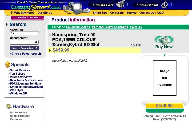 Update: The Treo 90 has been removed from CompuSmart's webstore. However, a screenshot of what was there is available.